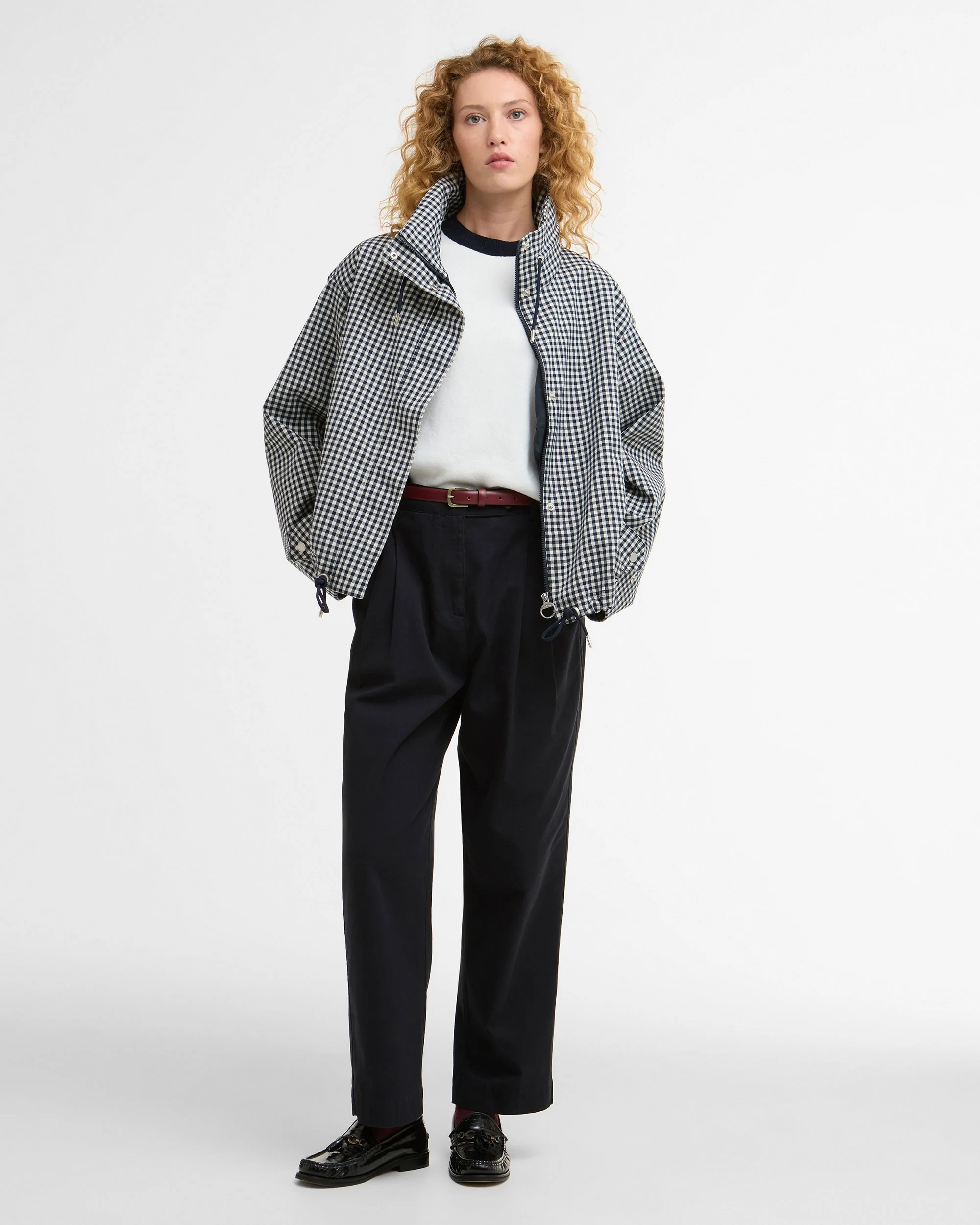 A modern take on classic outerwear, the Barbour Bronwyn Jacket features a cotton-touch gingham fabric with a showerproof finish. Designed with an oversized funnel neck, adjustable drawcords, and a concealed zip fastening behind a studded placket, it offers both style and practicality. Finished with front welt pockets and subtle Barbour branding.